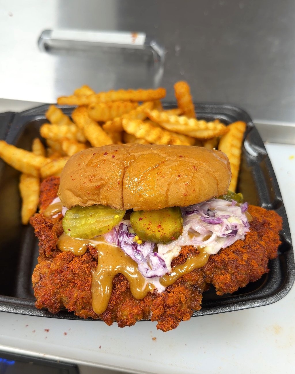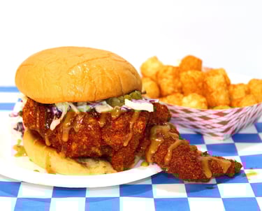 Fried boneless chicken breast served with pickles, slaw, rooster sauce on a butter bun.