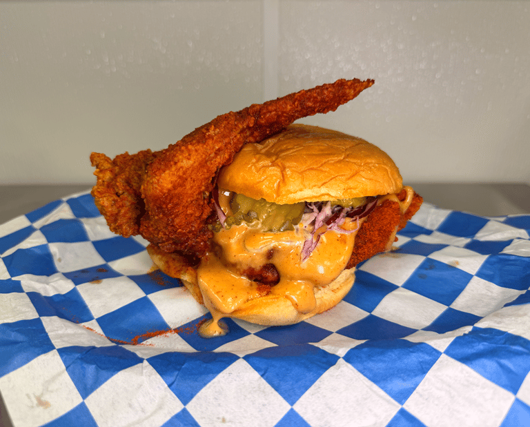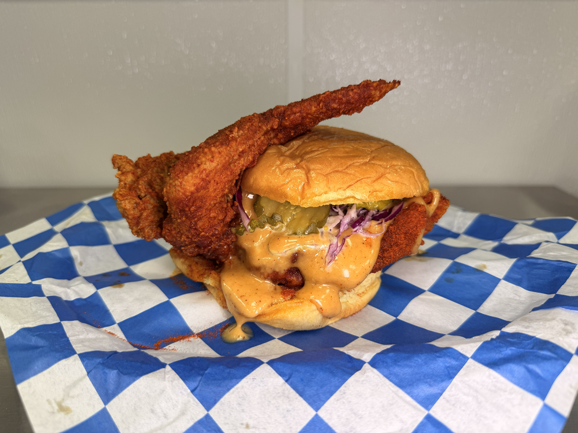 Giant chicken breast with a whole wings served with pickles, slaw, rooster sauce on a butter bun.